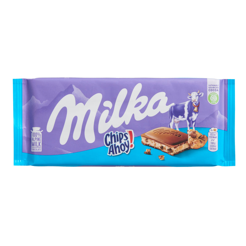 Delicious Milka Chocolates with Pieces of Chips Ahoy. Made with 100% Alpine Milk Chocolate. Imported from Europe.