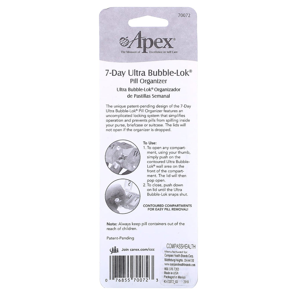 El diseño único pendiente de patente del organizador de píldora Ultra Bubble-Lok de 7 días presenta un sistema de bloqueo sin complicaciones que simplifica la operación y evita que las píldoras se derramen dentro de su bolso, maletín o maleta. Las tapas no se abrirán si se deja caer el organizador.
