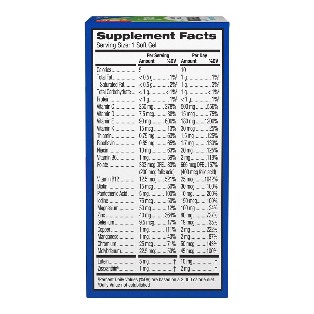 Suplemento de vitaminas y minerales. Los niveles exactos de seis nutrientes recomendados por el National Eye Institute para ayudar a reducir el riesgo de progresión en personas con degeneración macular relacionada con la edad moderada a avanzada (AMD). Esta fórmula viene en geles suaves fáciles de saquear. Este producto contiene betacaroteno.