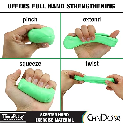 CanDo® Theraputty® hand exercise material is the standard in resistive hand exercise material. Each color-coded putty has a different consistency ranging from xx-soft for strengthening the weakest grasp to extra-firm for developing a stronger grip.