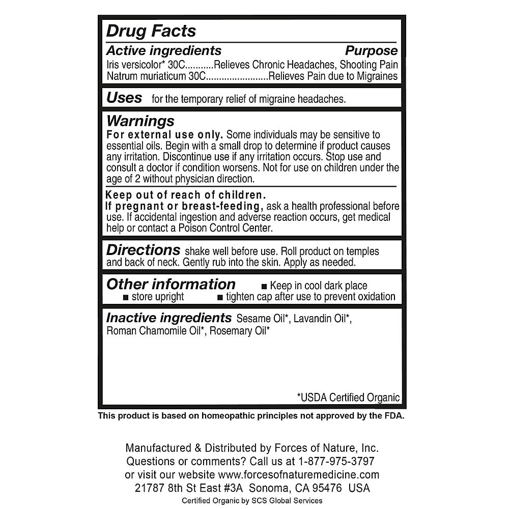 Forces de la naturaleza Medicina orgánica certificada El aplicador de rollerball de migraña combina el iris púrpura y el cloruro de sodio para el alivio del dolor de migraña aguda de acción rápida.