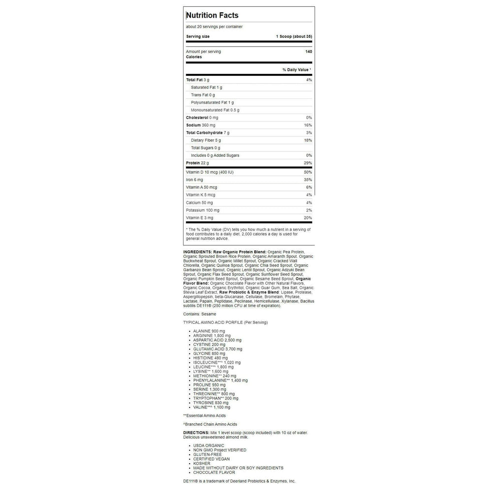 Top-quality protein powder that is 100% certified organic, raw, vegan, gluten free, dairy free and non-GMO. It's everything you want in a protein powder and nothing more. Raw Organic Protein Plant Based - Chocolate features 13 raw and organic sprouts, making it an excellent source of complete protein that delivers 22 grams of protein (including all essential amino acids).