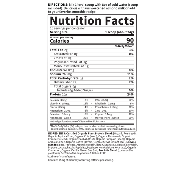La proteína vegetal orgánica ofrece proteína vegetal sin granos altamente digestible con 13 enzimas y mil millones de CFU de probióticos.