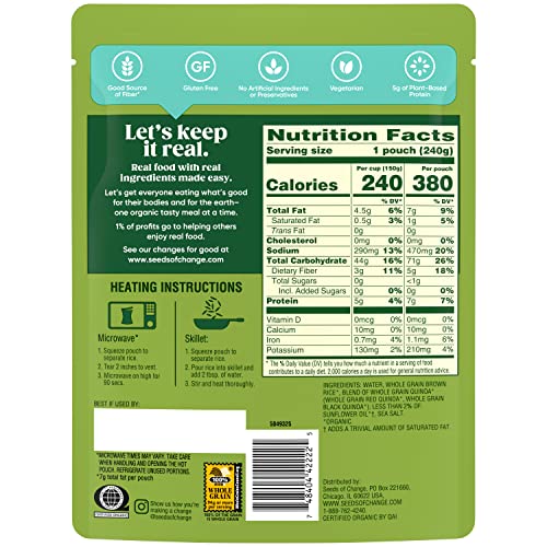 Seeds of Change Organic Quinoa and Brown Rice with Sea Salt delivers an easy-to-make combination for a wide variety of rice sides and organic rice bowls that you can enjoy with your loved ones. A nutritious mix of whole grain brown rice, quinoa super grains and sea salt is the perfect organic food and is a good source of fiber prepare your palate for the pure, wonderful flavors that blend effortlessly with organic kale and other veggies.