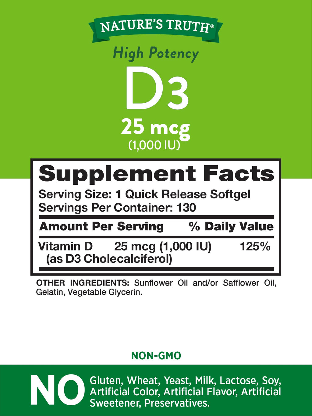 Nature's Verdad alta potencia Vitamina D3 1000 IU 130 Softgels