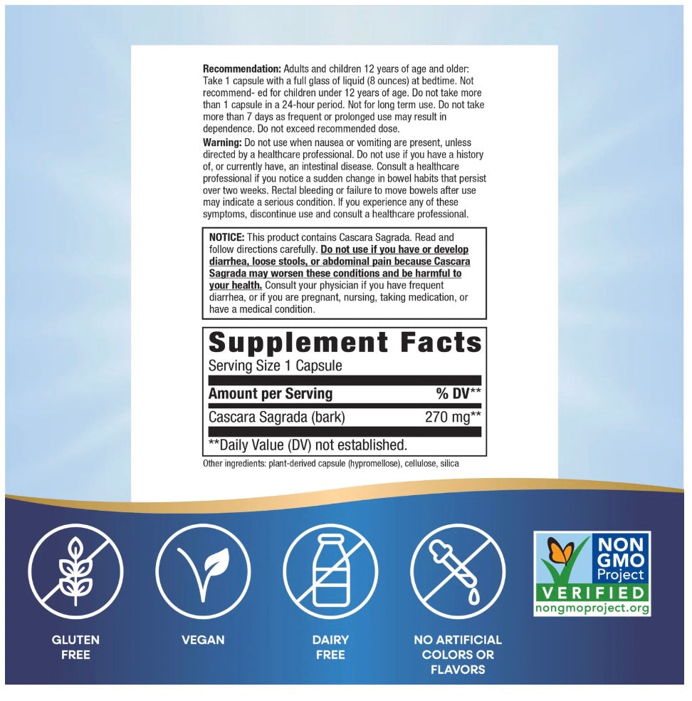 La corteza de Cascara Sagrada se ha utilizado durante miles de años para diversos fines, incluso para el alivio ocasional de estreñimiento. También se conoce como "corteza sagrada" y "corteza de Chittem". Nature’s Way Cascara Sagrada es una fórmula vegana que contiene 270 mg por porción para apoyar la función digestiva.