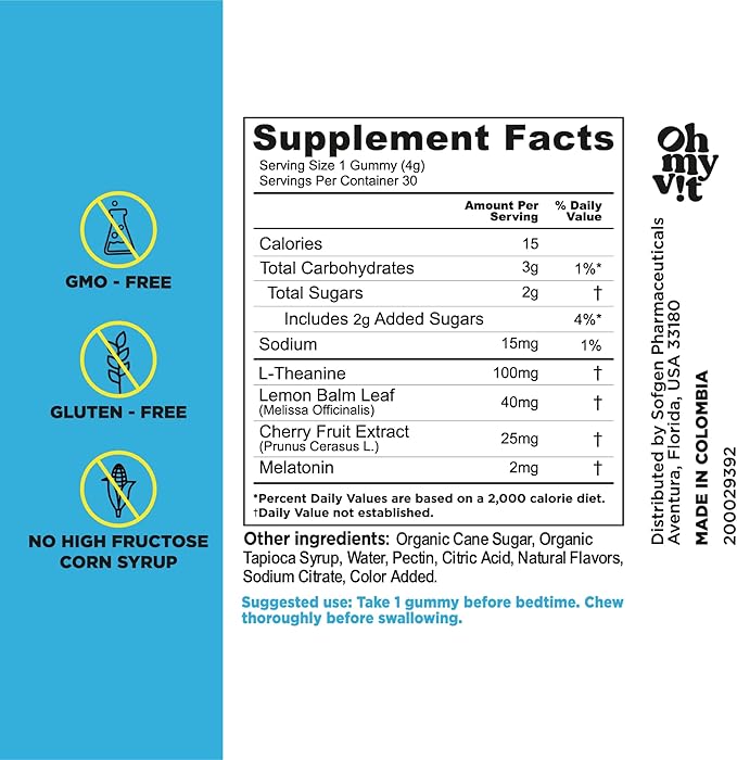 Mezcla única de ingredientes que incluyen melatonina, l-teanina, hoja de bálsamo de limón y extracto de fruta de cereza
