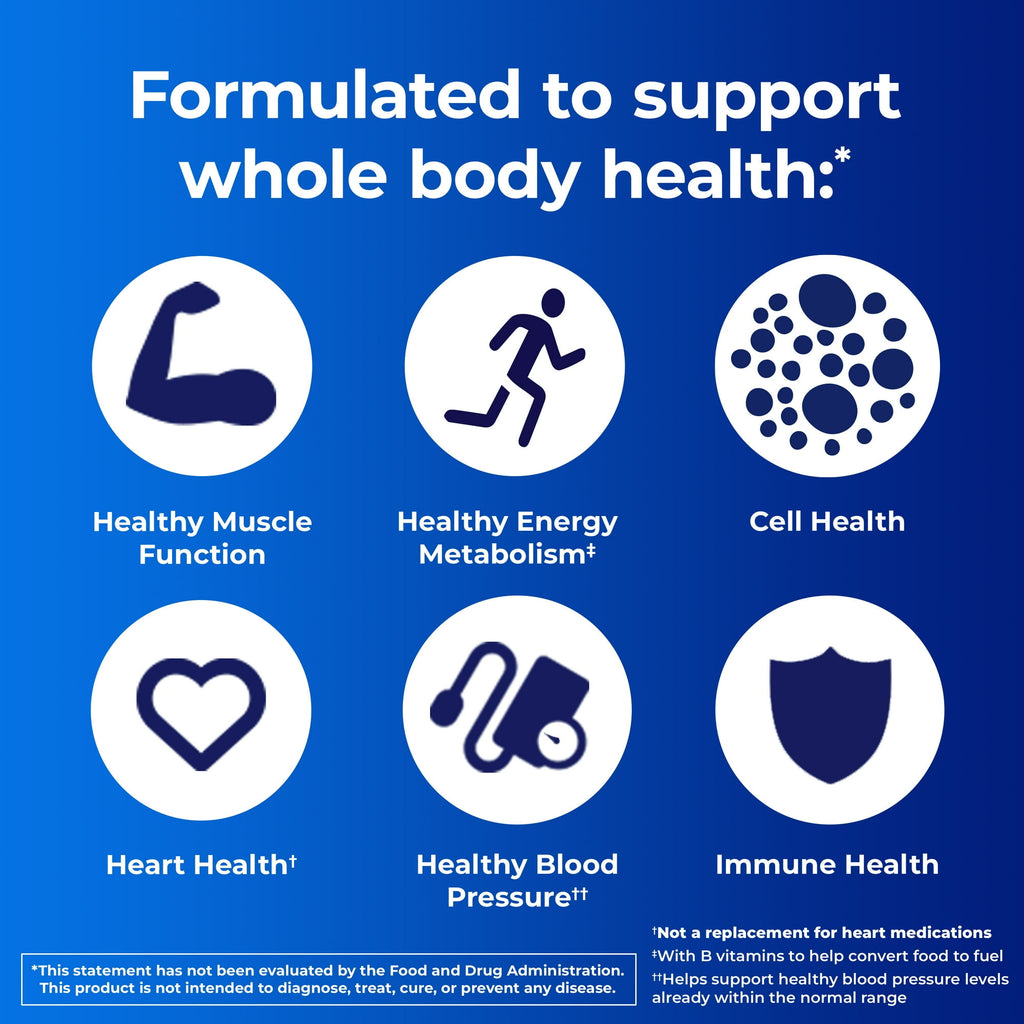 Formulated to support:* heart health, healthy blood pressure, immune health, healthy muscle function, and physical energy by helping convert food to fuel