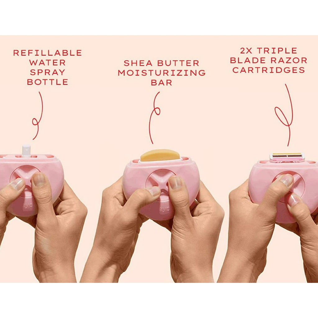 Refillable components include a water spray bottle, a Shea Butter moisturizing bar, and two triple-blade razor cartridges.