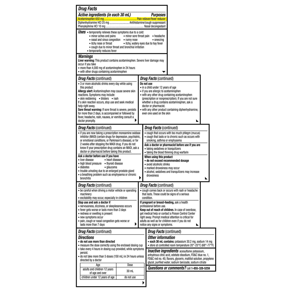 Cold and cough medicine for adults that contains acetaminophen 650 mg, diphenhydramine HCl 25 mg and phenylephrine HCI 10 mg