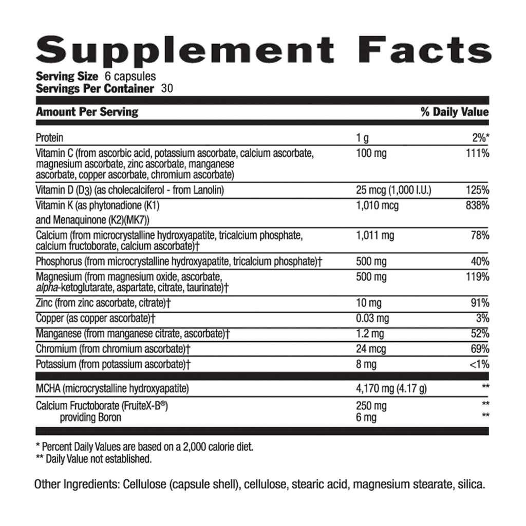 Una forma natural única de calcio, así como otros minerales que su cuerpo reconoce como similar a su propia composición ósea natural. La hidroxiapatita microcristalina (MCHA), la base de la fórmula sólida ósea, es una forma de fosfato de calcio que es idéntico a la composición ósea natural del cuerpo.