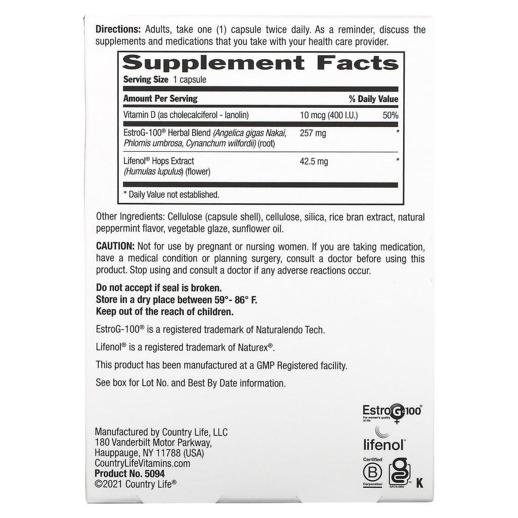 La fórmula de menopausia segura de Country Life con ingredientes clínicamente probados brinda atención completa de los principales síntomas menopáusicos. ESTROG-100® es un extracto de raíz botánico estandarizado que ayuda a reducir los síntomas asociados con la menopausia, mientras que el extracto de flores Lifenol® Hops mejora la calidad de vida en las mujeres menopáusicas. ¡No dejes que la menopausia controle tu vida!