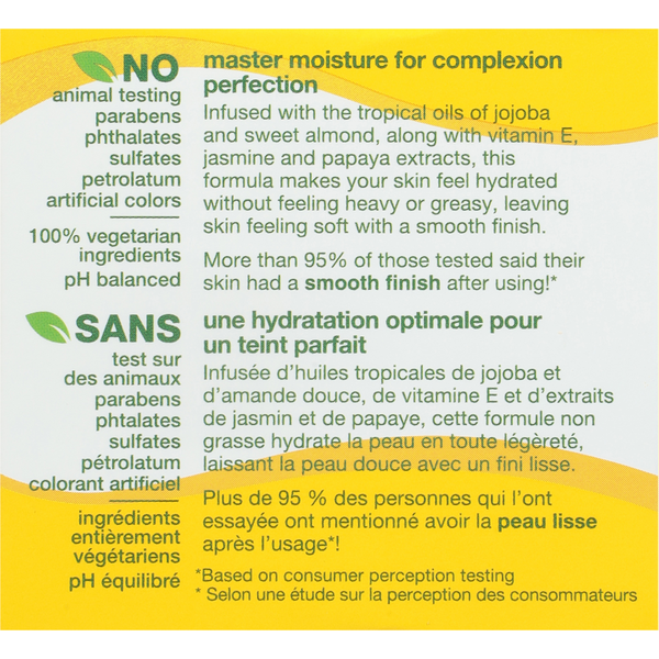 Master moisture for complexion perfection infused with the tropical oils of jojoba and sweet almond, along with vitamin E, jasmine and papaya extracts, this formula makes your skin feel hydrated without feeling heavy or greasy, leaving skin feeling soft with a smooth finish.