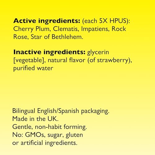 VeganNon-AlcoholOriginal Flower RemediesWith BACH® Natural Flower EssencesHomeopathicRESCUE® Kids helps calm young minds & bodies while relieving symptoms of everyday stress*. Made with RESCUE REMEDY®, the original 5-flower essence blend trusted worldwide since 1936.Gentle for daily useHomeopathic - will not interfere with other medications or supplementsPlant-based natural active ingredientsNo: artificial flavors or sweeteners, synthetic dyes, gluten, sugarUse: temporary relief of symptoms of everyday stress as occasional:AnxiousnessRestlessnessIrritabilityMade in an FDA-registered ...