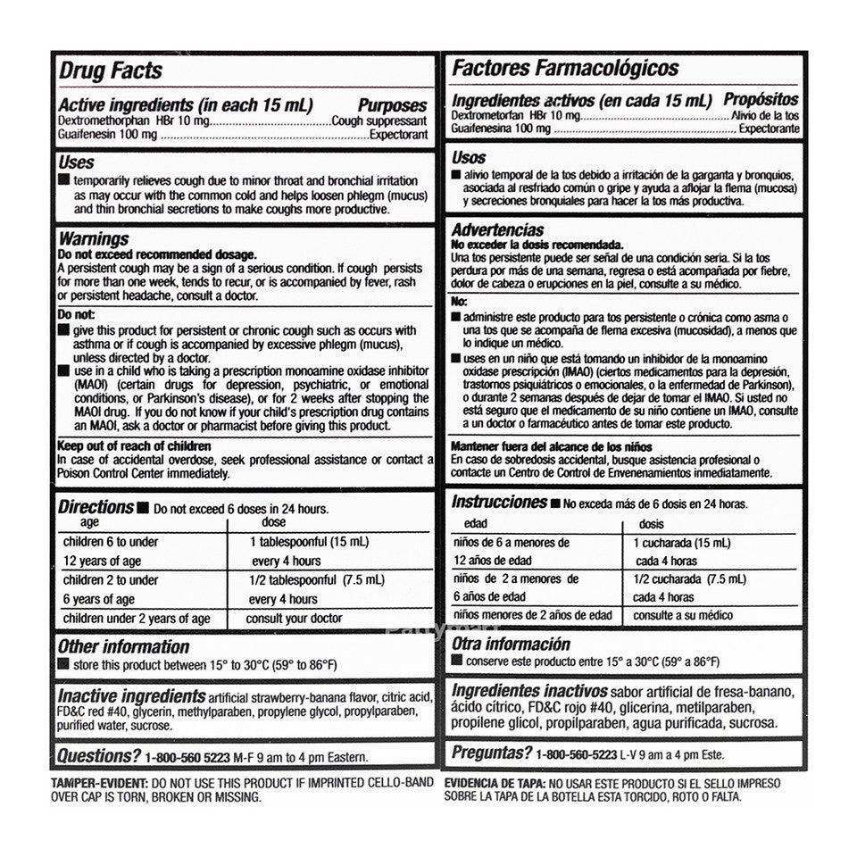 Ingredients: Guaifenesin 100 mg - Expectorant, Dextromethorphan - Cough Suppressant, artificial strawberryt-banana flavor,