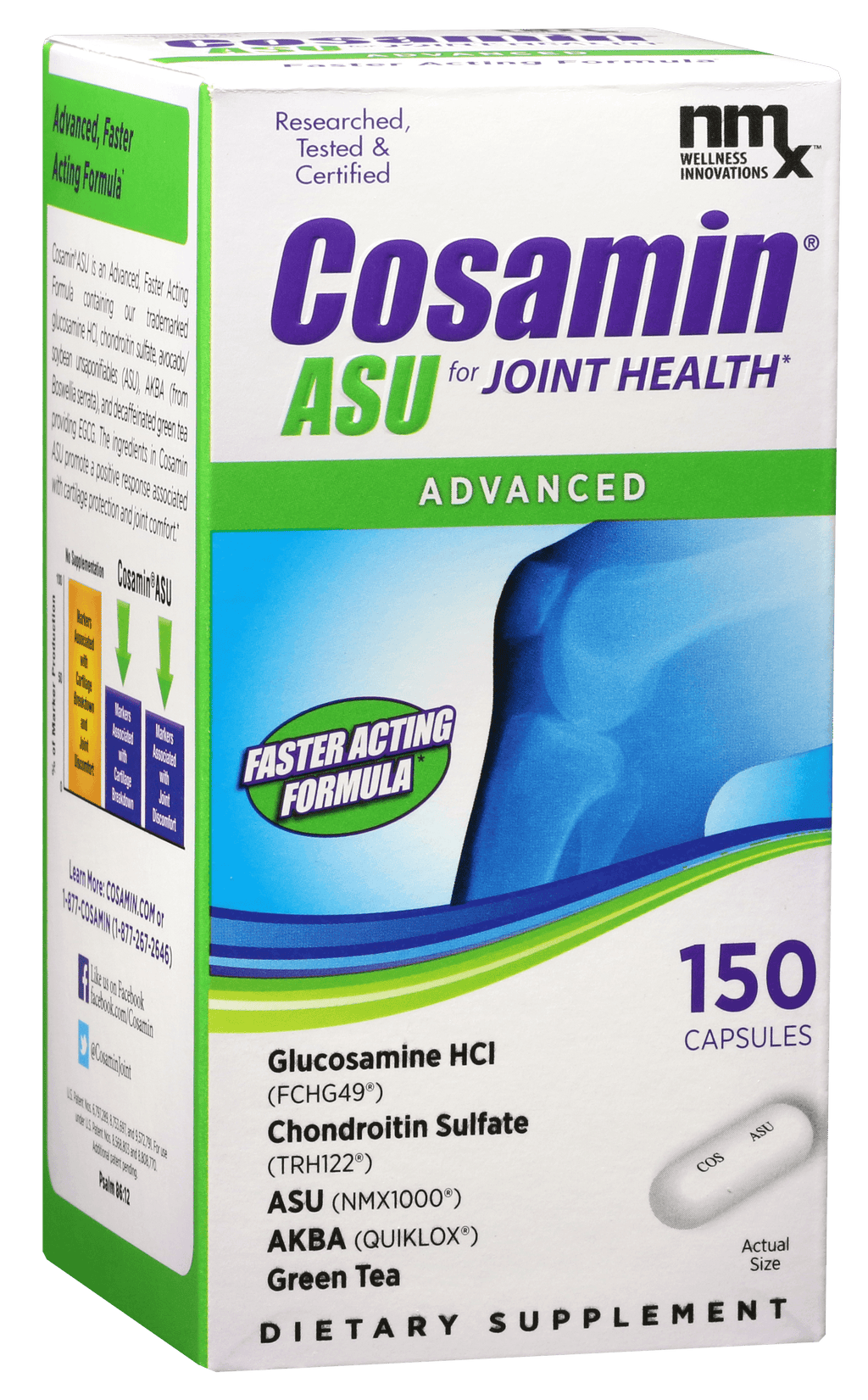 • Cosamin ASU contains patented combinations of our trademarked glucosamine, chondroitin sulfate, and avocado/soybean unsaponifiables with the added benefit of AKBA from Boswellia serrata, and decaffeinated green tea extract providing EGCG. The ingredients in Cosamin ASU promote a positive response associated with cartilage protection and joint comfort.