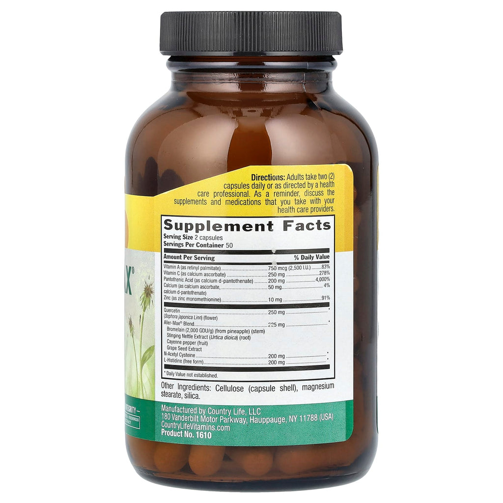 Country Life's Aller-Max® is a unique complex based on the key ingredients of Quercetin, Bromelain, and Vitamin C. Quercetin is a naturally occurring non-citrus bioflavonoid derived from flowers buds. Bromelain is an enzyme derived from Pineapple Stem. Aller-Max® also provides Vitamin C as well, alongside herbs like Stinging Nettle and Cayenne.