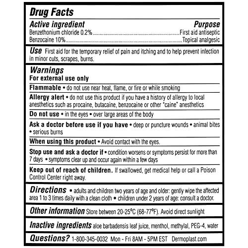 Formulated with 10% benzocaine (a topical pain reliever) and a no-sting antiseptic, plus soothing aloe to moisturize skin.