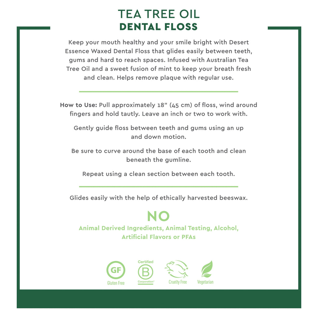 Desert Essence Tea Tree Oil Dental Floss is naturally waxed and saturated with pure and natural Tea Tree Oil. For best results, use with Desert Essence Toothpaste, Mouthwash, and Dental Pics.