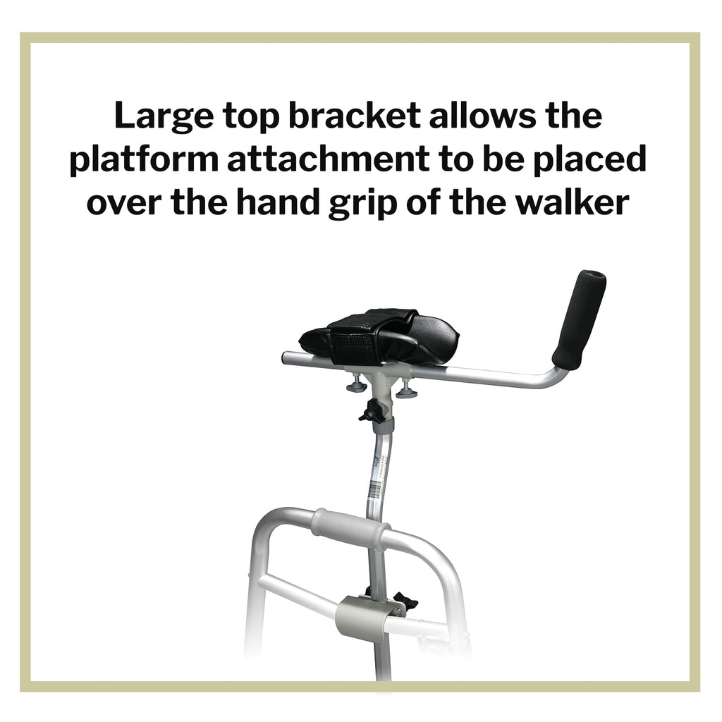 If you experience difficulty in reaching down to grasp your walker, the Platform attachment is an excellent solution. The platform affixes easily to your walker and allows you to keep your arms in a more comfortable position to operate your critical mobility device. The platform is padded for maximum comfort and an adjustable strap keeps your arm securely in place.