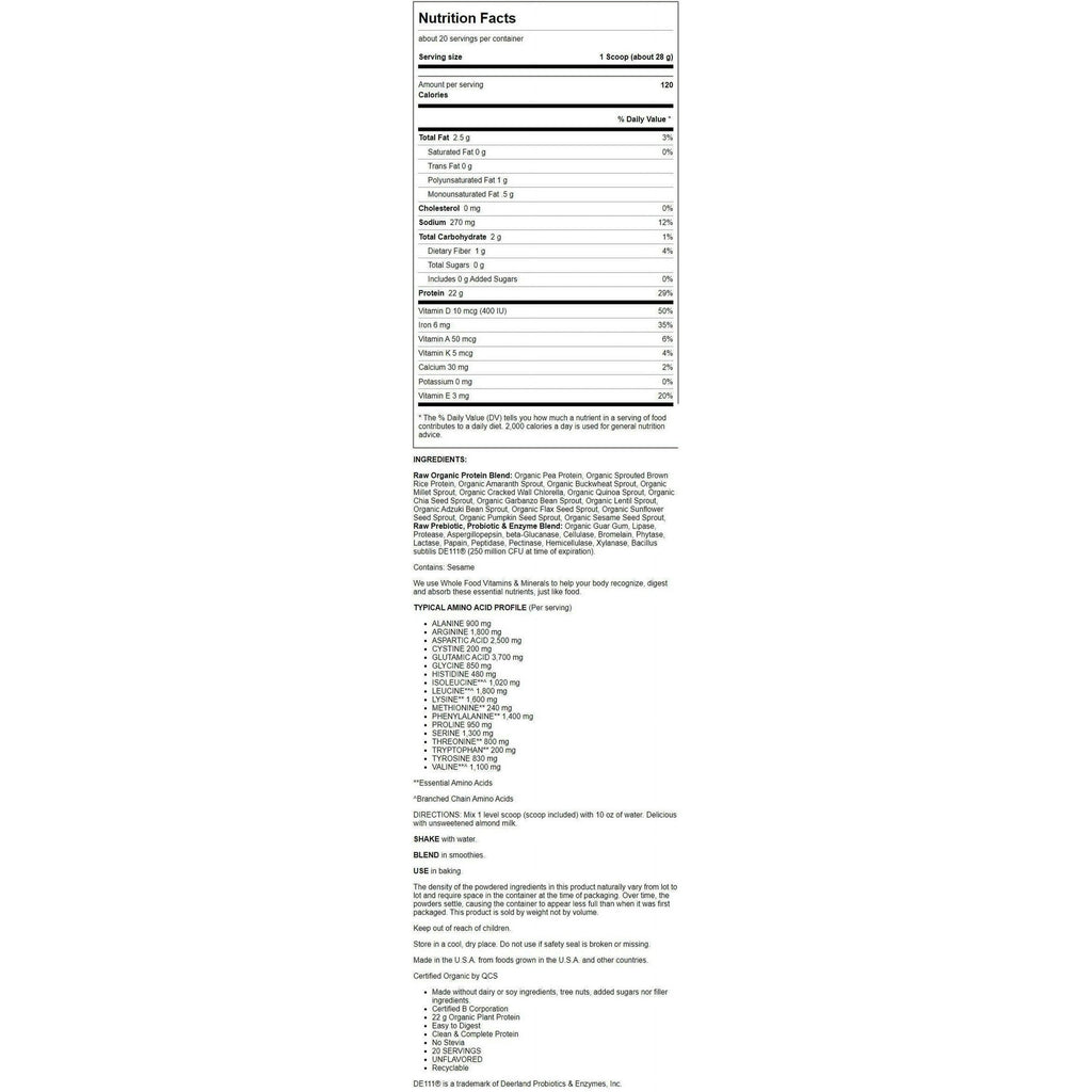 Unlock the nutritive power of living grains and seeds with Garden of Life Raw Organic Protein - Plant Based--a certified organic, raw, vegan protein powder. Featuring raw and organic sprouts, RAW Organic Protein is an excellent source of complete protein, providing 22 grams and 44% of the Daily Value, including all essential amino acids.