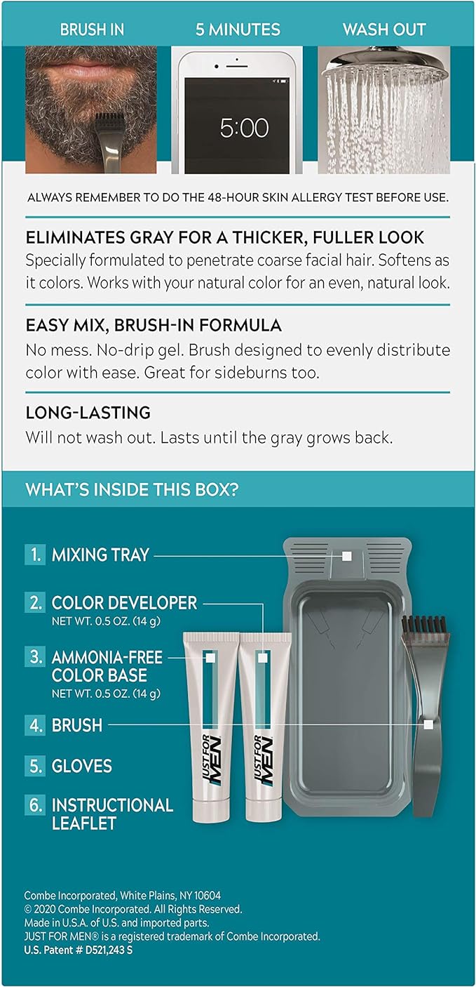 Multiple application facial haircolor kit. Eliminates gray for a thicker fuller look. 3 Easy Steps (Always remember to do the 48-hour skin allergy test before use): Mix. Brush. Wash. Works on even the coarsest facial hair. 5 Min. Won't wash out. Lasts until gray grows back. Brush in. 5 minutes. Wash out.
