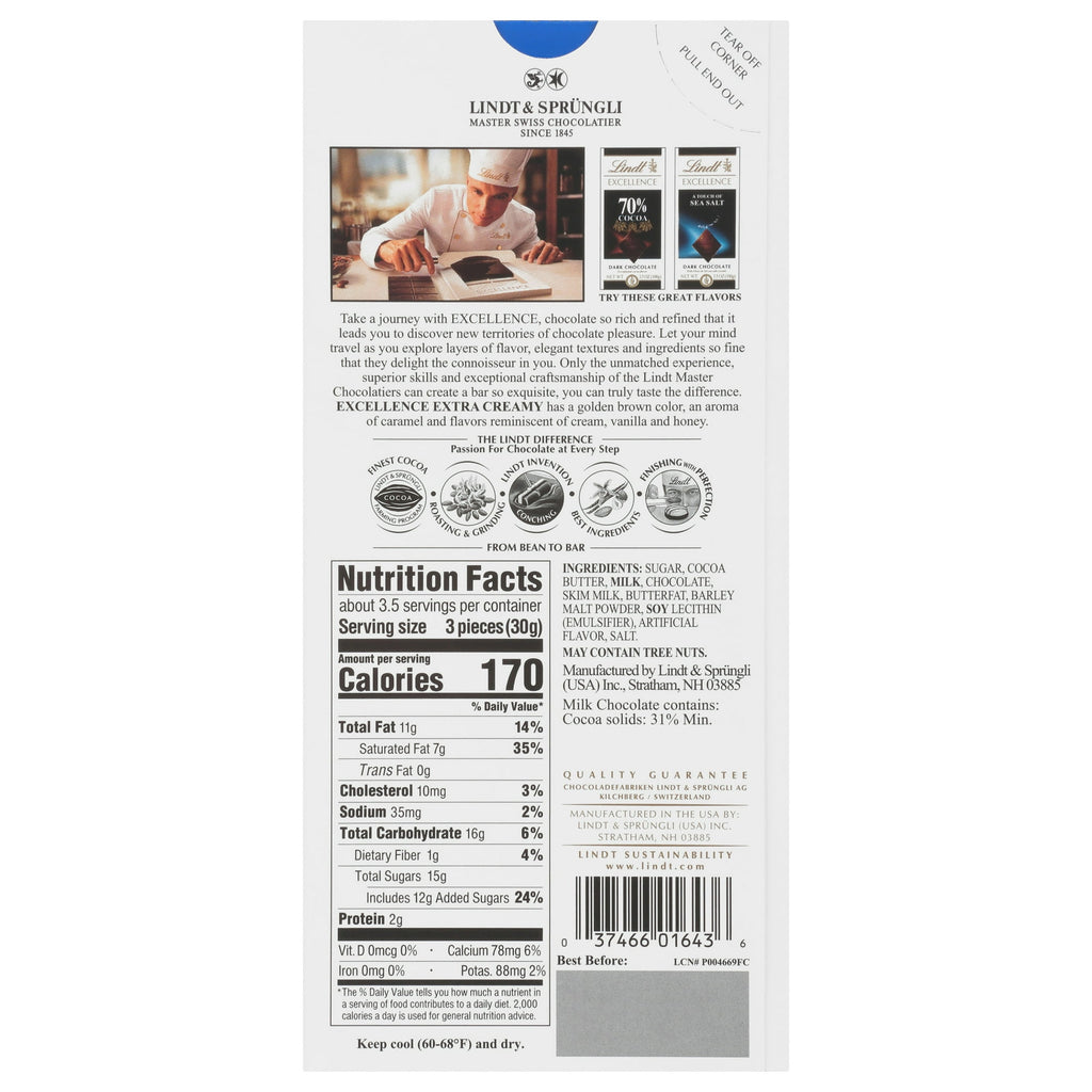 Lindt EXCELLENCE Extra Creamy Milk Chocolate Bar. Offering the ultimate chocolate experience, this exceptionally smooth and silky milk chocolate bar is distinguished by a golden brown color, caramel aromas, and delicate flavors reminiscent of cream, vanilla and honey.