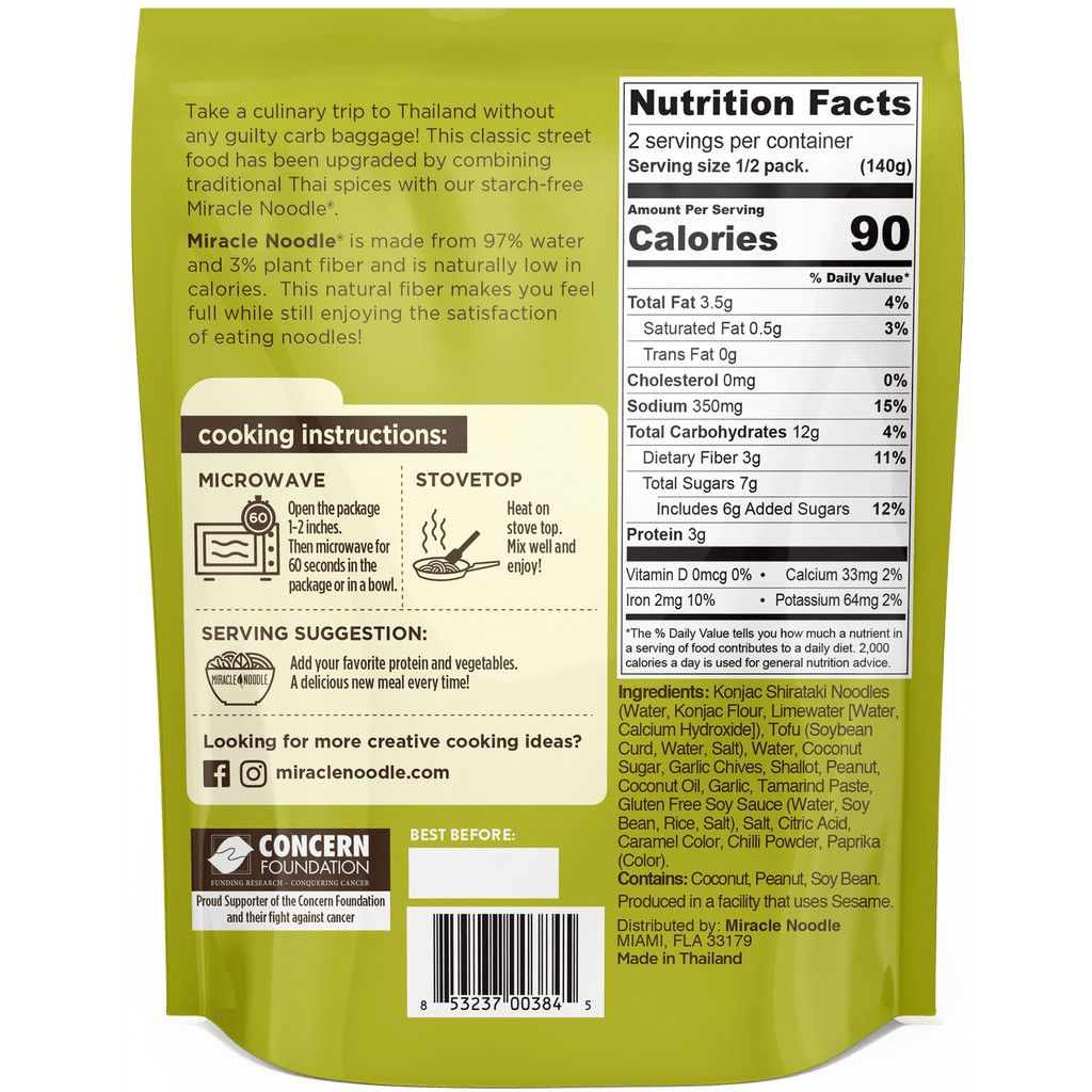 Miracle Noodle Ready-to-Eat Pad Thai helps you meet your health goals without the extra effort. Each package starts with our good-for-you shirataki noodles - tasty, plant-based noodles that are low in carbs, sugar and calories - and is then dressed up with an array of yummy Thai flavors, including peanuts, light soy sauce, garlic and coconut oil.