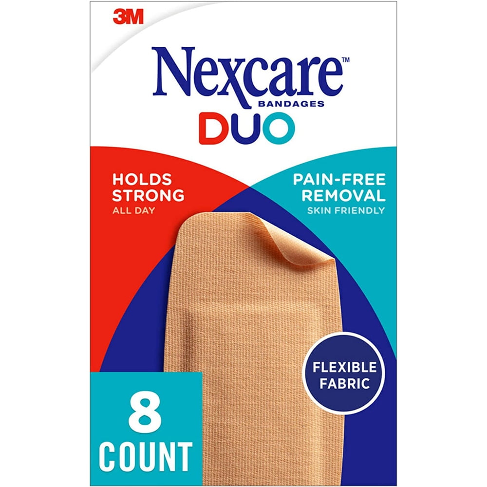 8-count pack of Nexcare Duo Bandages featuring a nonstick pad and skin-friendly material for easy, painless removal