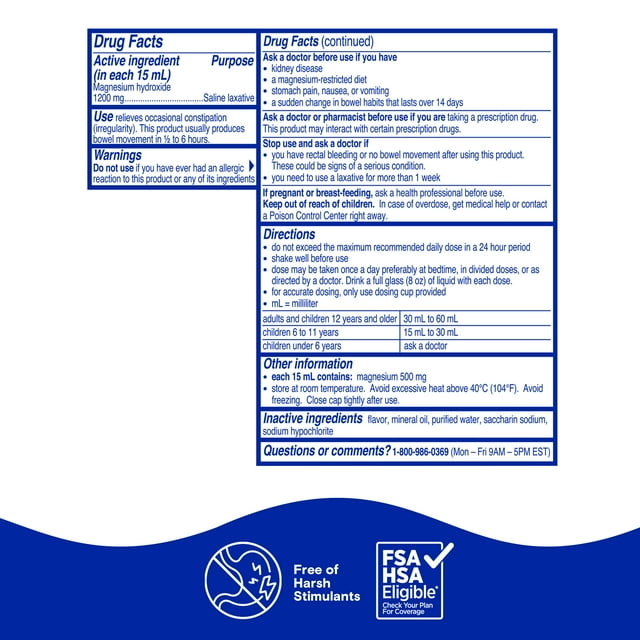 Formulated with Magnesium Hydroxide, Phillips' Milk of Magnesia offers cramp-free, gentle relief of occasional constipation without the use of harsh stimulants. Gives you gentle, overnight relief.