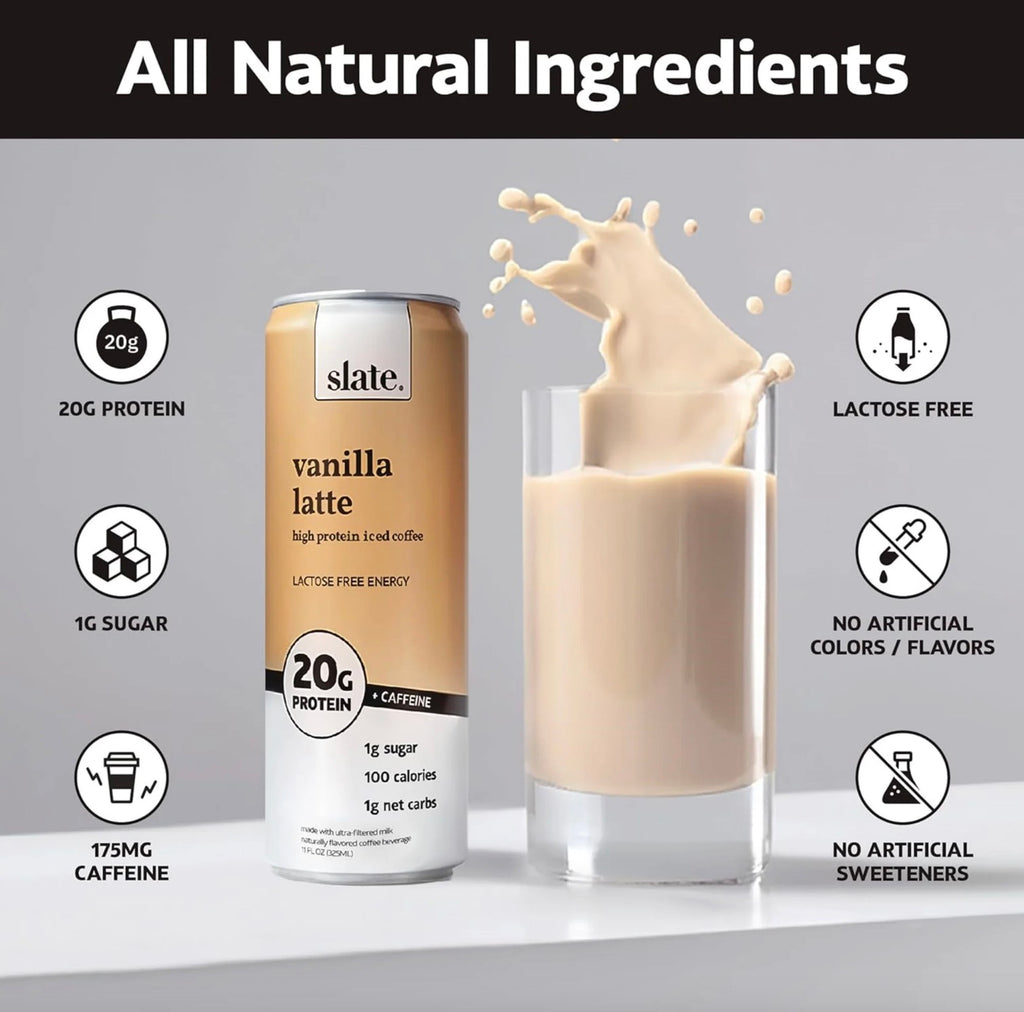With 175mg of day-crushing caffeine, our ready to drink Slate Vanilla Latte is delicious, hits like a double espresso, and contains 20g of muscle building protein.