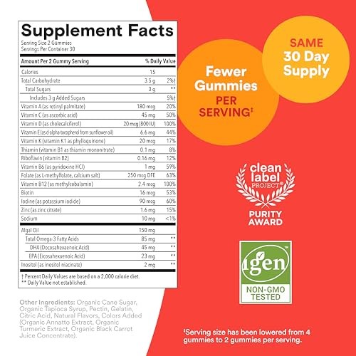 SmartyPants Kids Plus Multi & Omegas are formulated with 16 nutrients including vitamin D3 for immune support*, K for bone health*, B12 to support energy metabolism*, A for eye health*, folate as methylfolate, as well as Omega-3 DHA/EPA from algal oil in a convenient two-gummy serving.* Specifically-formulated based on the latest scientific research to help fill average nutrient gaps kids may have, Kids Plus Multi & Omegas include premium forms of nutrients their bodies can more easily absorb, like vitamin D as D3, vitamin B12 as methylcobalamin, zinc citrate and folate as L-meth...