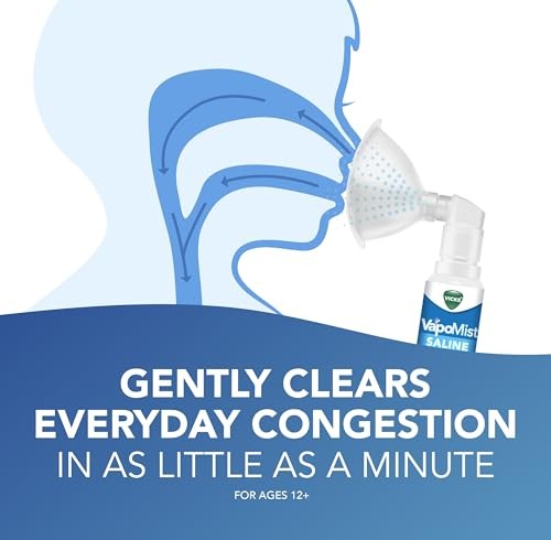 VapoMist Saline is an easy to use, saline mist, which provides effective relief for your congestion. To use, simply attach the mask to the Vicks Vapo Mist bottle, twist the top to activate, breathe in the soothing saline mist and non-medicated Vicks vapors, and quickly experience congestion relief in as little as a minute. VapoMist Saline is easy to use, mess free, and effective, gently clearing everyday congestion from year round allergies and colds. VapoMist Saline is drug free, and safe to use with prescriptions and OTC medicine. VapoMist Saline is perfect to use any time of the day o...